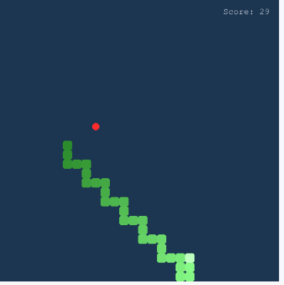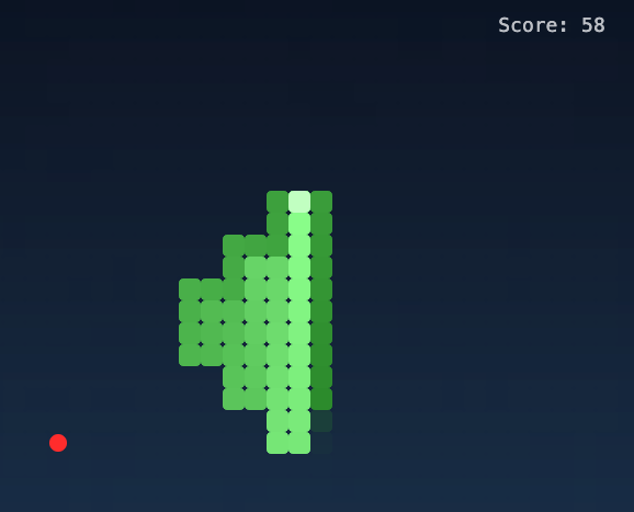 这个游戏仅仅300行js代码,但是效果让我惊掉下巴了。游戏完美地满足了我仅仅简单描述的需求,小蛇会走之字线路前往食物所在地,并且知道用较长的线路来避免自己碰到自己。截图中蛇头为最浅的绿色,蛇尾为最深的绿色。 在小蛇自己得了58分之后,终于碰到自己游戏结束。