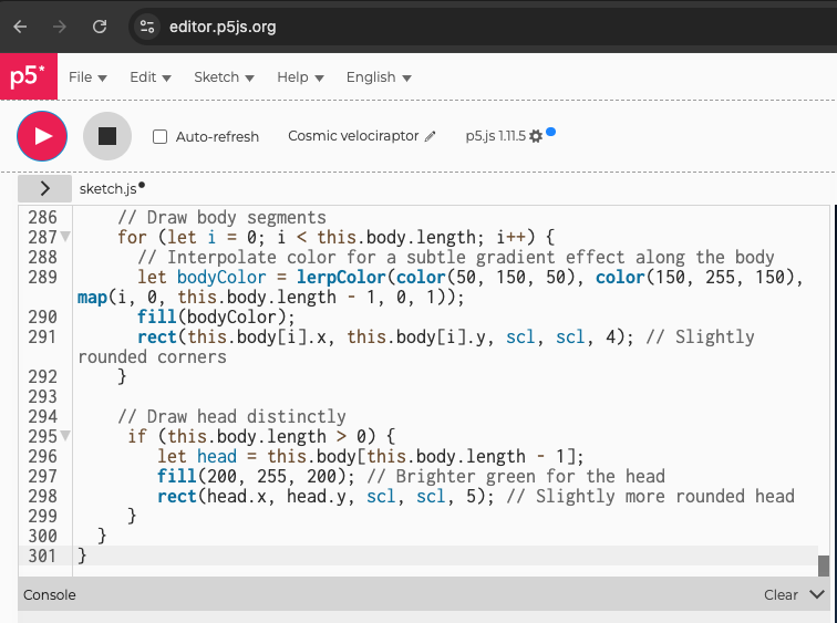 create a beautiful interactive ps5js snake game (no html),