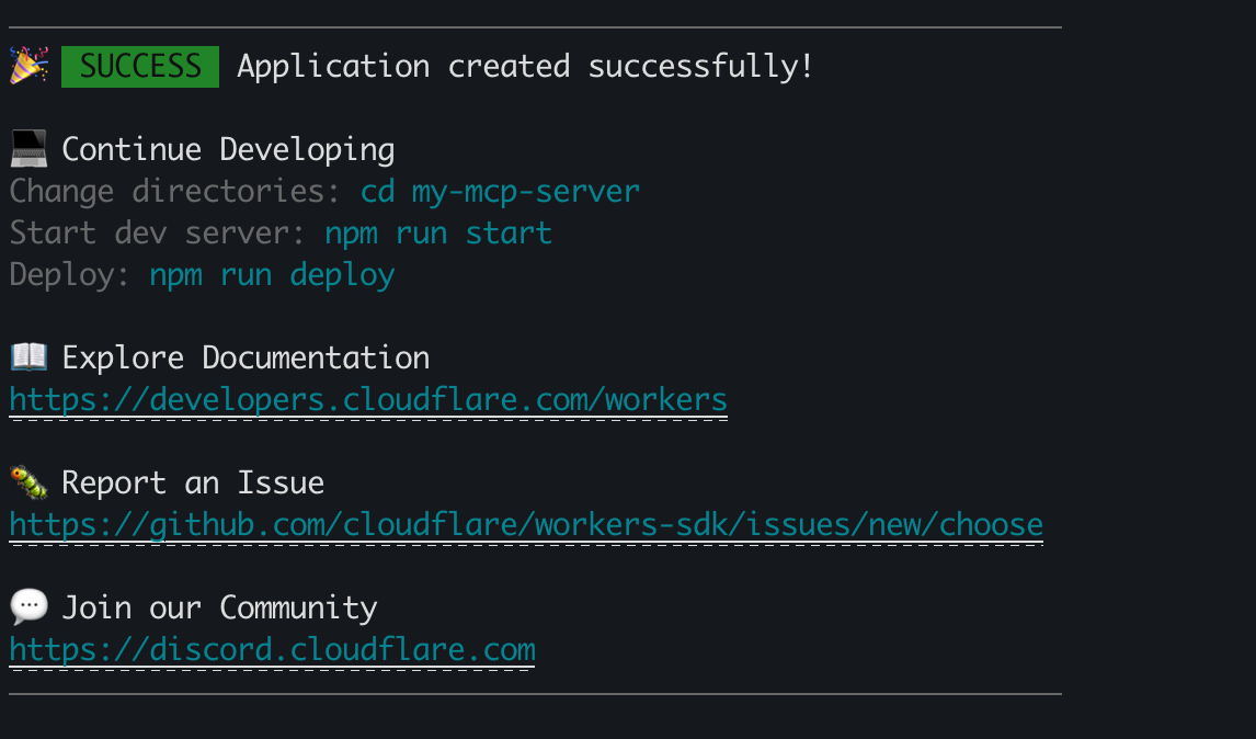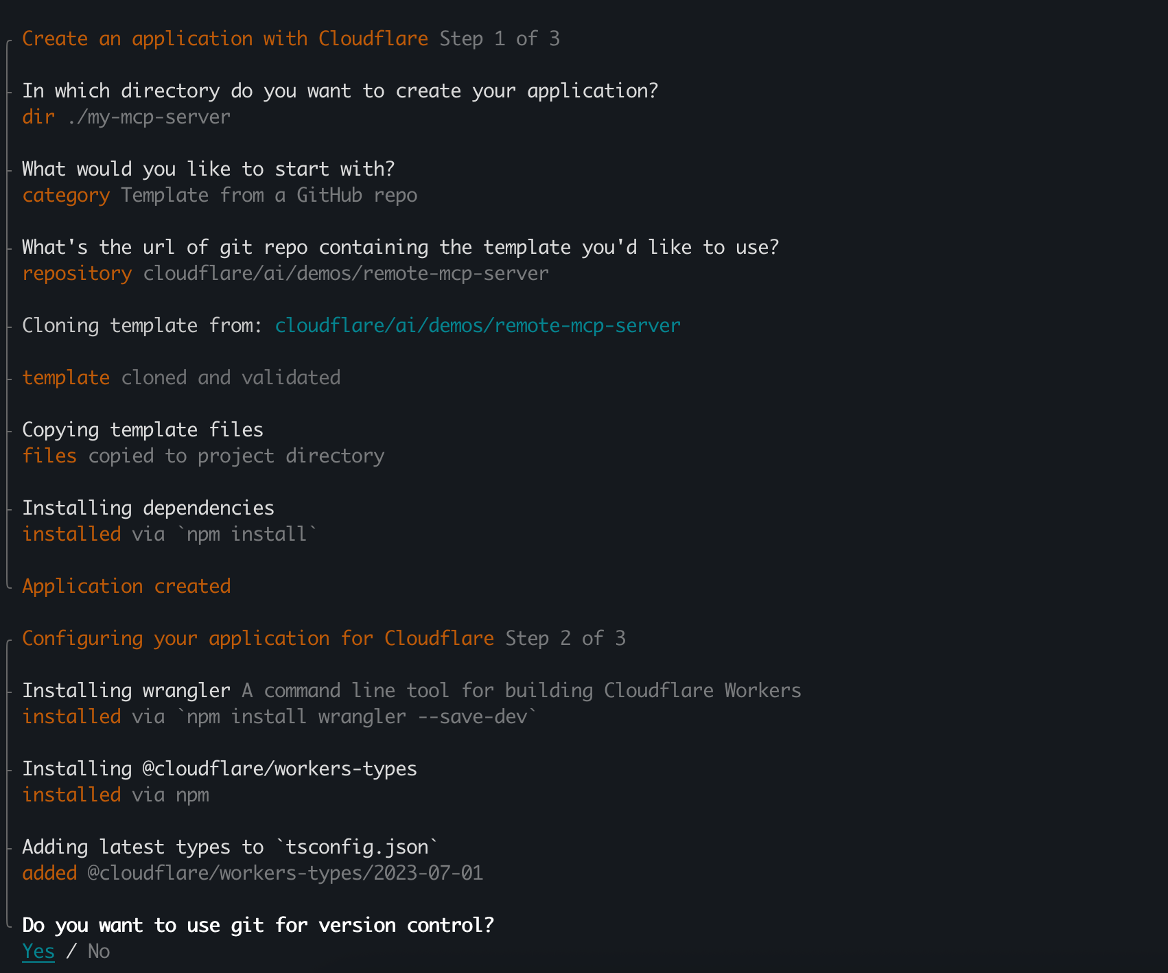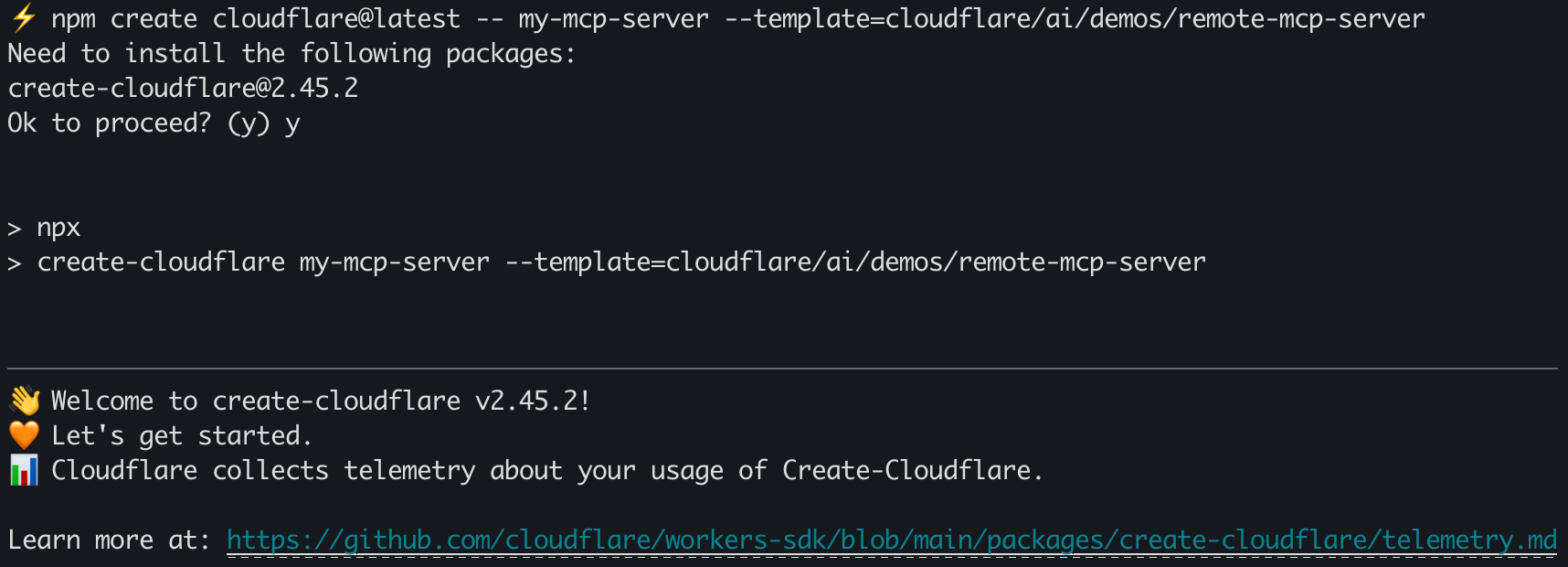 npm create cloudflare@latest -- my-mcp-server --template=cloudflare/ai/demos/remote-mcp-server