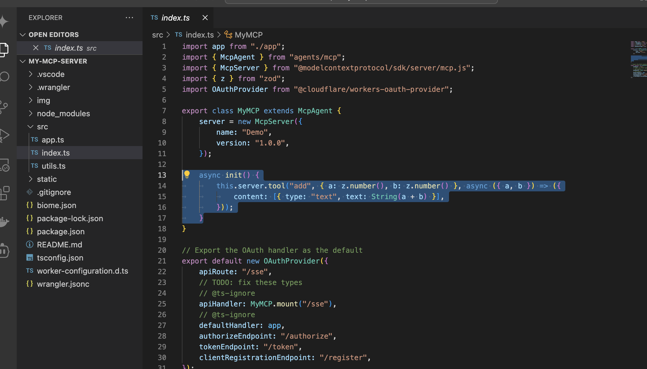 这里是用Typescript实现的,但是万变不离其宗,注意这里的两个类 McpAgent 和 McpServer, 而响应“/sse”这个endpoint的就是MyMCP类,这个类正是继承了McpAgent,MyMCP有一个‘server’成员,在异步函数‘init()’中添加了这个工具“add”,你可以在去MCP Inspector页面上看一看,“add”的大小写是不是完全一样,所以这一行就是注册add工具的地方。