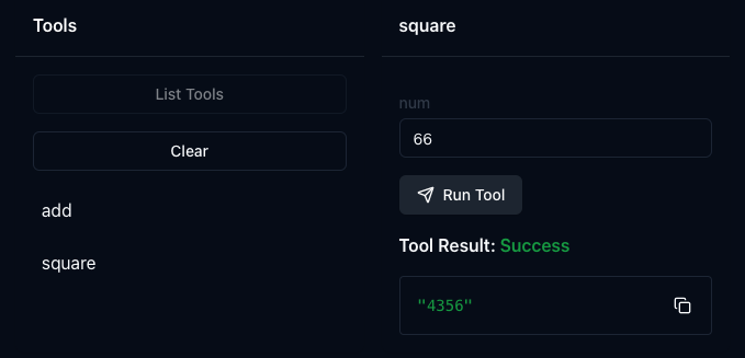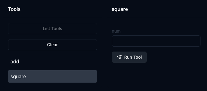 新添加的工具只接收一个参数,进行二次方运算后返回一个text, 现在我们可以重启下项目,npm start, 再切换到MCP Inspector界面上,需要重新Connect一下,因为服务器重启过了,然后再“List Tools”,这样就可以看到新添加的squre工具了