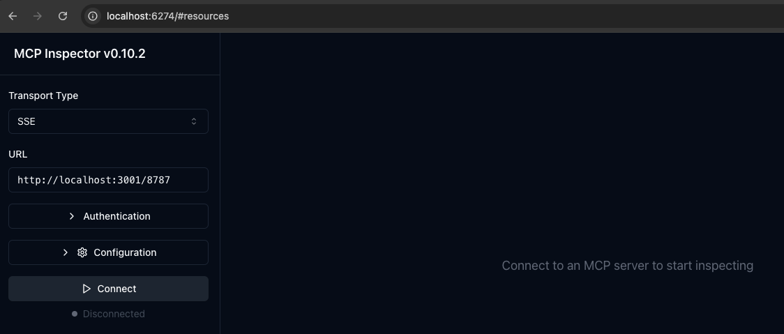 打开http://localhost:6274 , 这个端口号可能会有所不同,注意看你自己的屏幕上显示的端口号