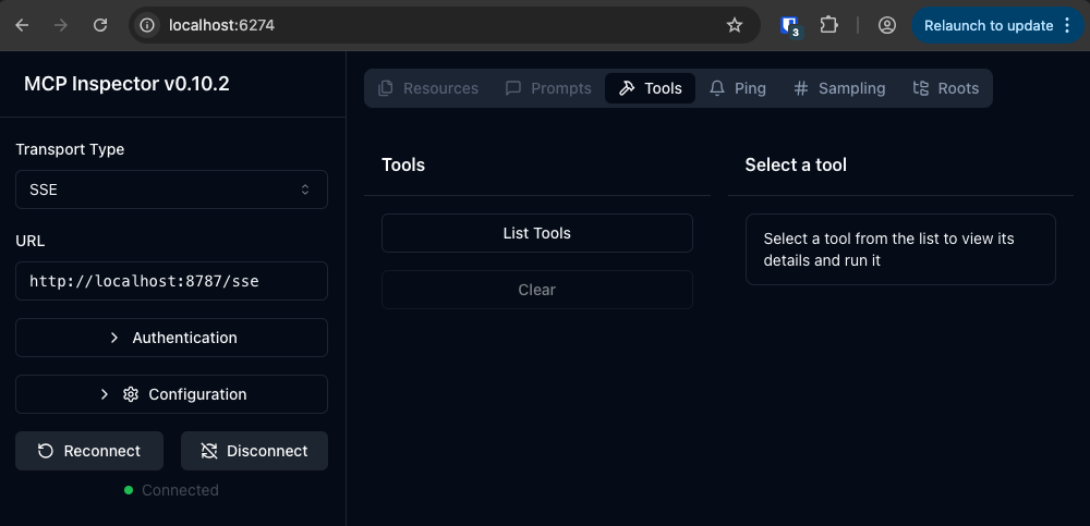选择Transport Type为SSE,URL里填入上面我们的服务器地址 http://localhost:8787/sse