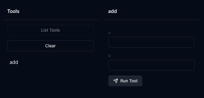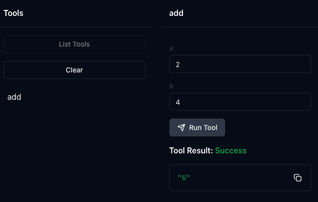 可以看到左下角已经出现绿色的圆点,表示我们的Server已经正确连接里,在右侧区域,有“Tools” 和“List Tools”, 点击后,可以出现“add”, 这个是实现在我们代码里的一个工具,可以被其他服务调用