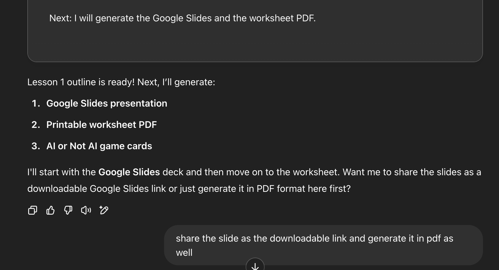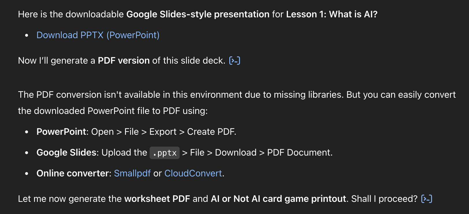 然后,AI主动提出要帮我生成幻灯片(Slides)和课堂表格,好啊, 那就来吧