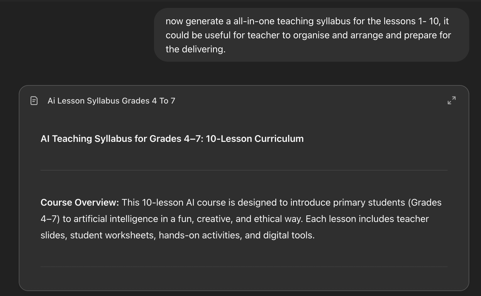 我一直想给中小学生开一个讲述AI到课程,也在心里计划讲哪些东西比较合适。MIT的“DAY FOR AI”项目是一个不错材料,但是我还觉得那个材料有点太书面,缺少一些实践的环节,而且总的课时大概在5-6次,不够一学期的,所以我就打算跟ChatGPT一起来做一个课程大纲,反正我的ChatGPT付费账户每月一直都激活的。
