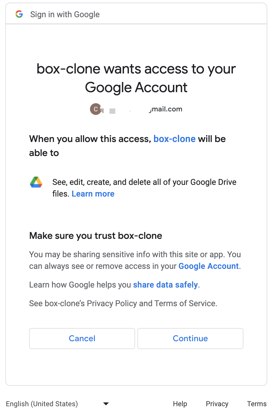 在提示“Use web browser to automatically authenticate rclone with remote?” 选择Y,这时会打开一个本地浏览器界面,如果提示“不安全。。。”等等,就点击文字左下角有个文字链接(叫高级或者Advanced)继续下去,这时会显示下图界面,点继续