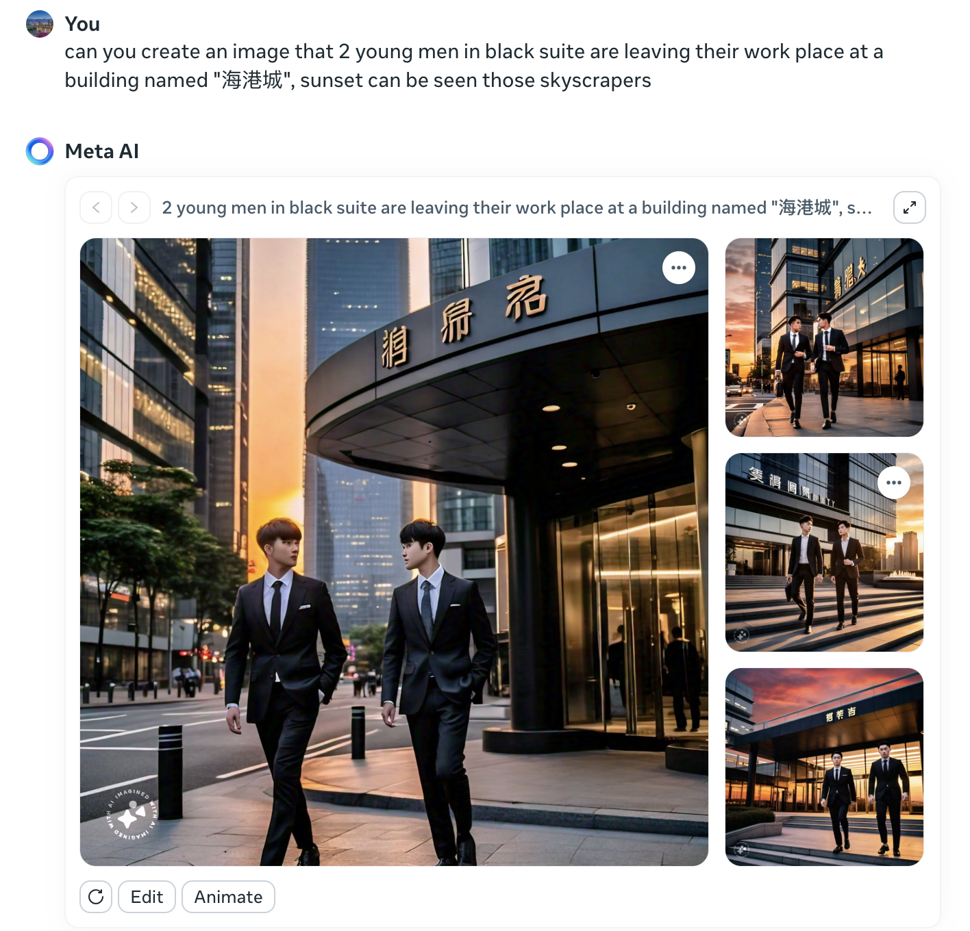 can you create an image that 2 young men in black suite are leaving their work place at a building named “海港城”, sunset can be seen those skyscrapers