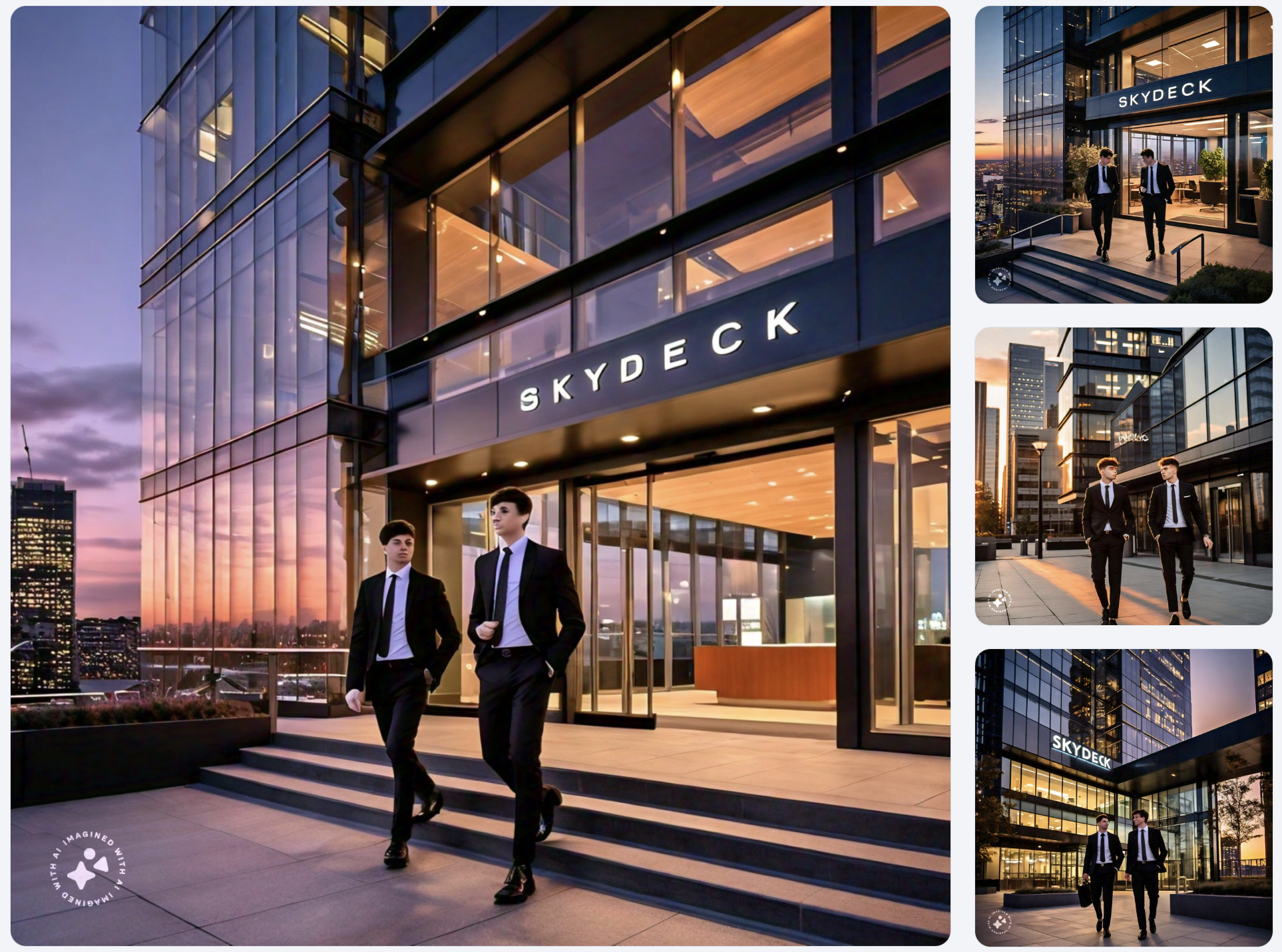 2 young men in black suit are leaving their work place at a building named SkyDeck, sunset can be seen those skyscrapers