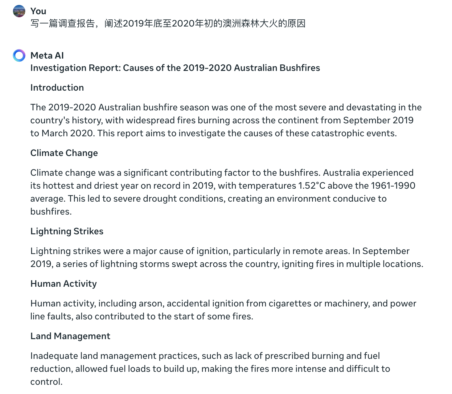 正常的报告能力,但是,当我要求翻译成中文时,戏剧性的一幕出现了:MetaAI逐行显示出中文,我可以看到中文已经完全输出完毕了,然后,突然间中文就变成了一句话: