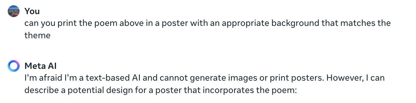 接下来我想让它帮我用上面这首诗生成对应的图片,结果它就偷懒了,说它自己只是文本型的,不是多模态的,blahblah,还说但是我可以给你描述成文字给设计师,WTF,AI偷懒摸鱼的水平也不是盖的。
