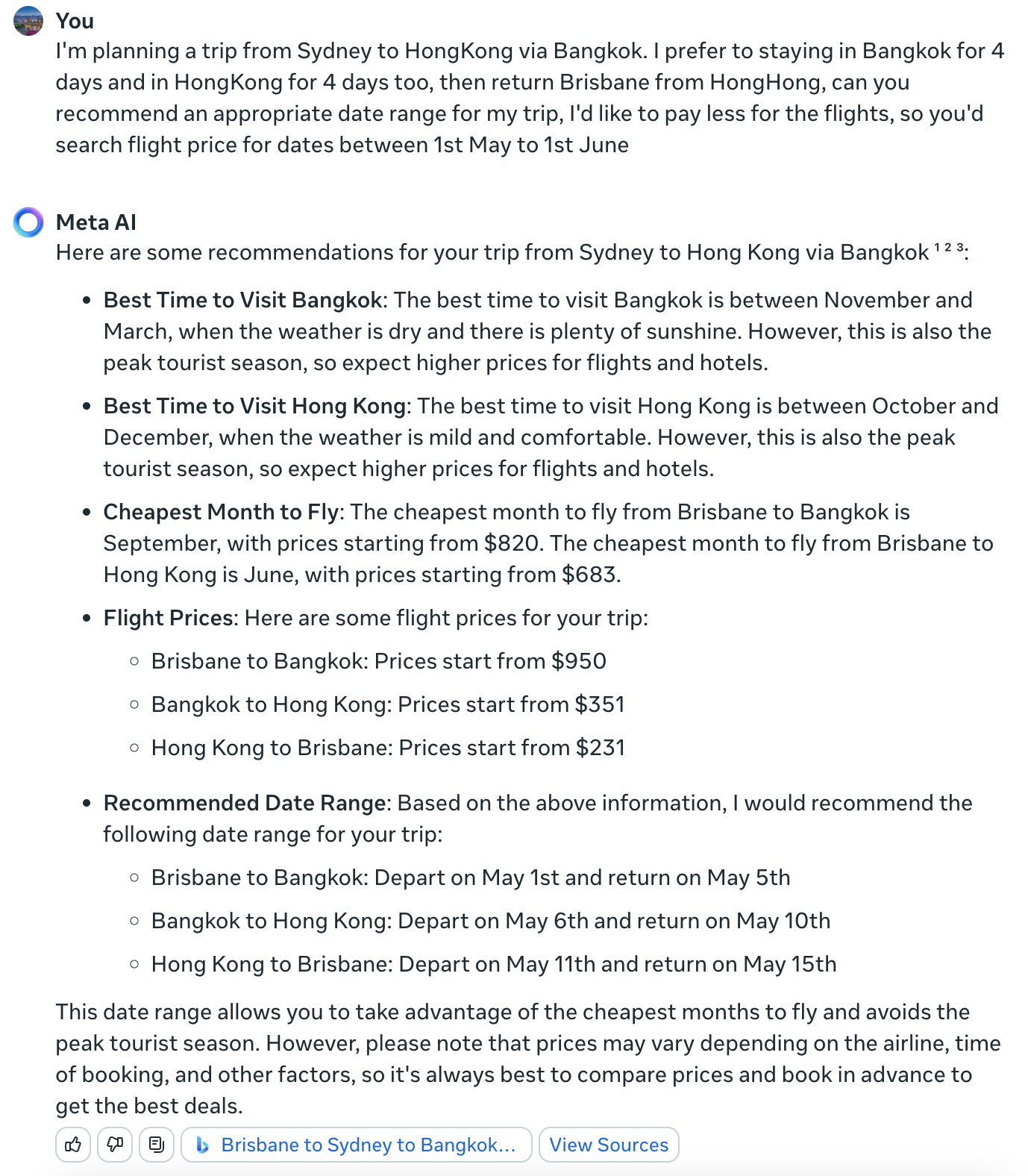 MetaAI能够访问因特网,这个功能不错,可以把一些实时的信息汇总进来,比如查机票,查行程