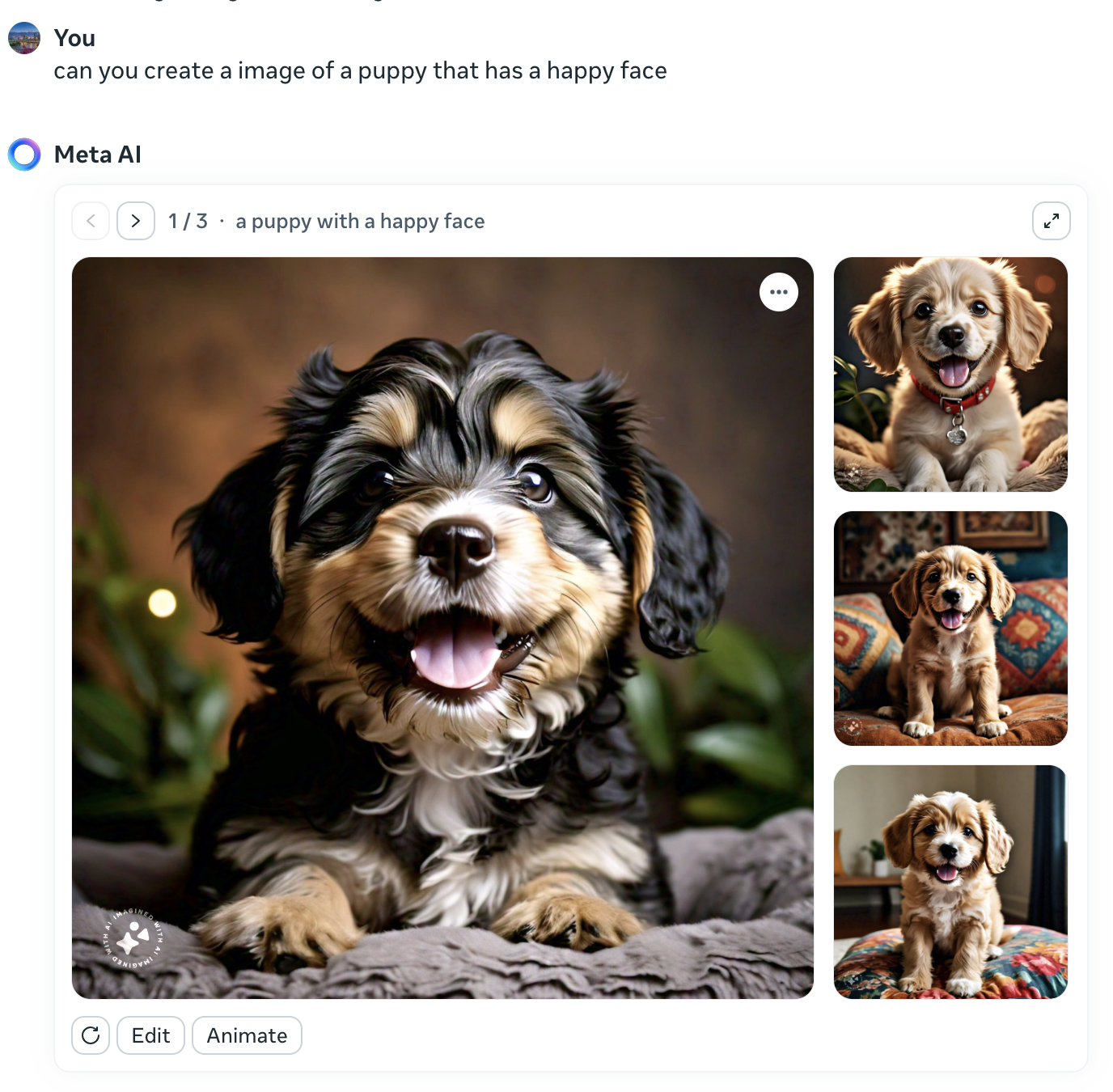 针对生成的图像,还可以进行二次编辑,当然,是通过prompt(提示语)来编辑,比如,我想要白色的小狗,MetaAI会在之前的理解基础上再加上新的要求,重新来生成(见下图白色)