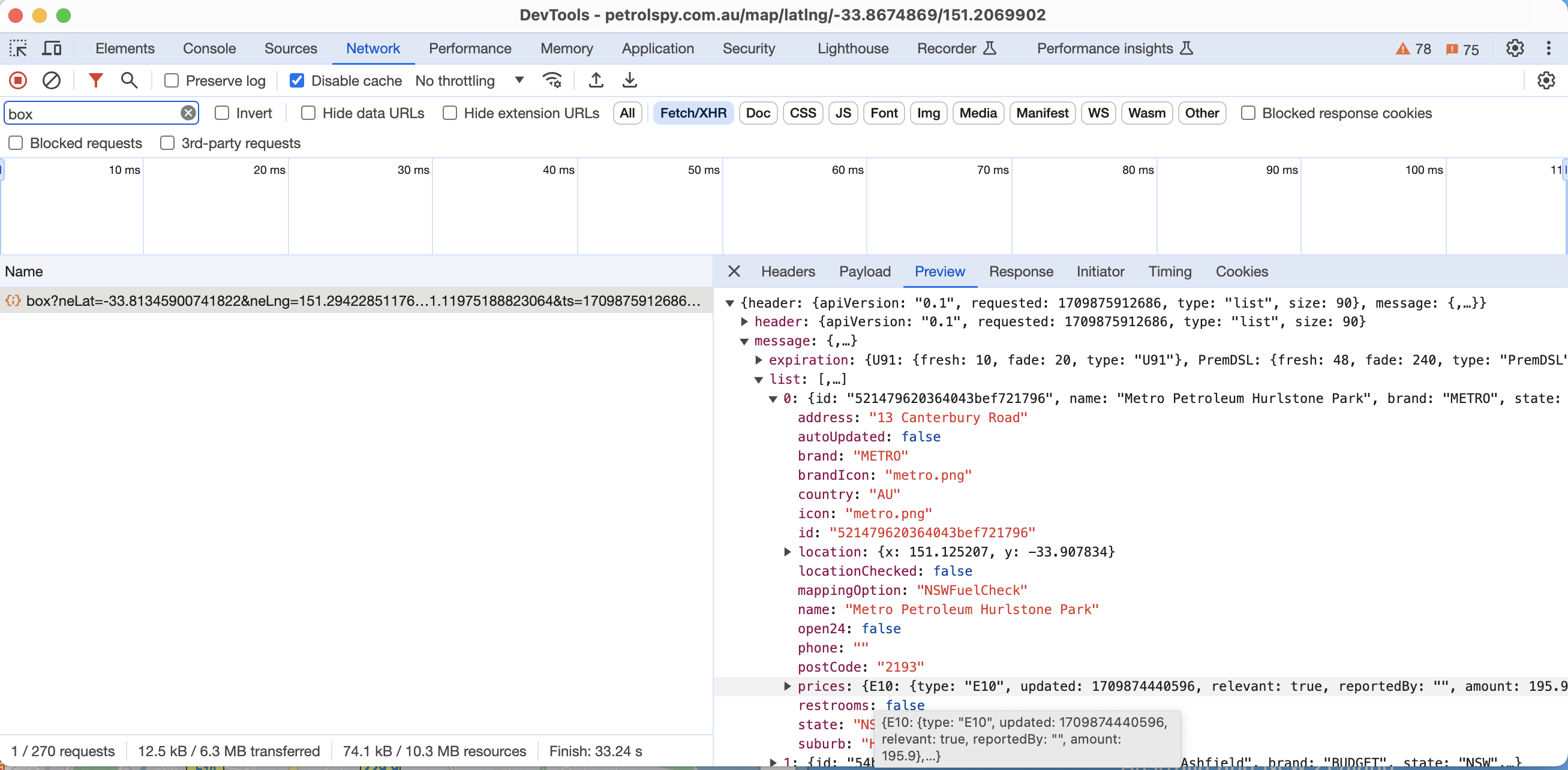 现在拖动地图,观察“network”请求的列表,会发现有一个“box?“的请求每次都会返回一个复杂的JSON数据